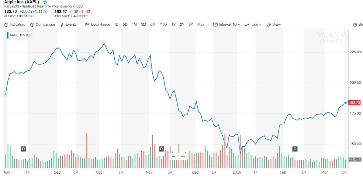 市場を揺るがすほどのショックを与えた、当のアップルの株価推移をみると『アップルショック』の日を底値に、以前ほどの勢いはないものの「しっかりとした上昇」を続けています。