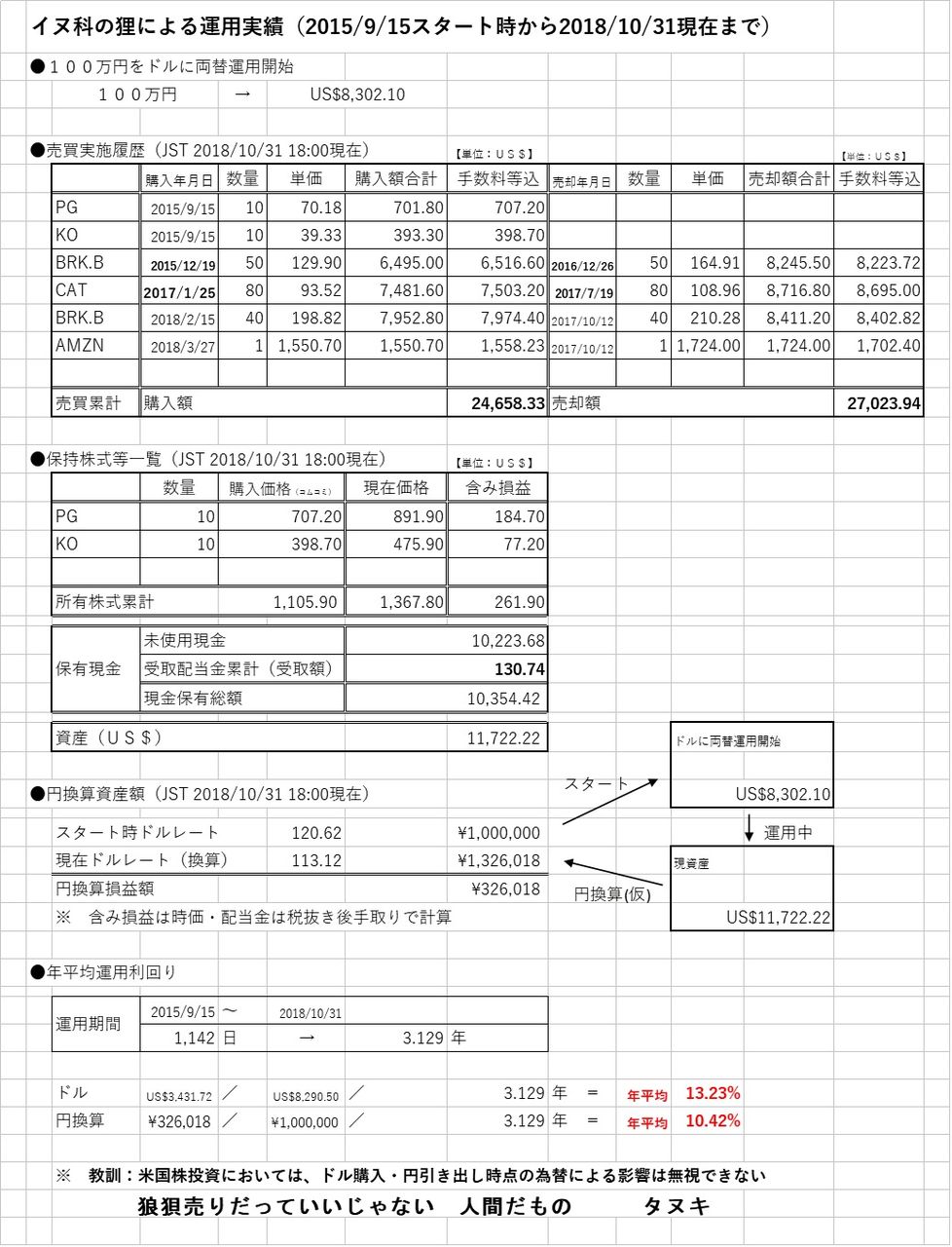 2018/10/31時点 運用実績「逃げるは恥だが…結果オーライ?」